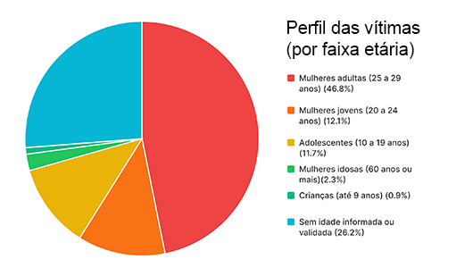 O estudo aponta para um alargamento do perfil etário das vítimas de violência, indicando que o problema atravessa cada vez mais etapas do ciclo de vida feminino. Embora a violência continue se concentrando majoritariamente em mulheres adultas, de 25 a 59 anos, os dados mostraram crescimento tanto entre meninas e adolescentes quanto entre mulheres idosas, ampliando o desafio para as políticas de enfrentamento voltadas a quem menos consegue pedir ajuda.